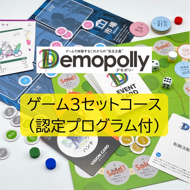 [デモポリー認定プログラム ゲーム3セットコース] Demopolly(デモポリー)は、 “遊びながら民主主義を体験できる” ボードゲーム型ワークショップ教材です。 こちらの商品は 認定ファシリテーター講座(テキスト+動画)付きの 1 セットコースです。 <セット内容> ①Demopolly ゲームセット × 3 -(最大15名までプレイ可能) ②認定ファシリテーター講座(動画・テキスト教材一式) ③ファシリテーションガイドブック(冊子) ④ゲーム進行用スライド(動画埋め込み) ⑥専用サイトへのアクセス権  → 教材ダウンロード / 補助資料 / 追加セット購入フォーム 詳細はこちらのページでも紹介しています: https://demopolly.studio.site/